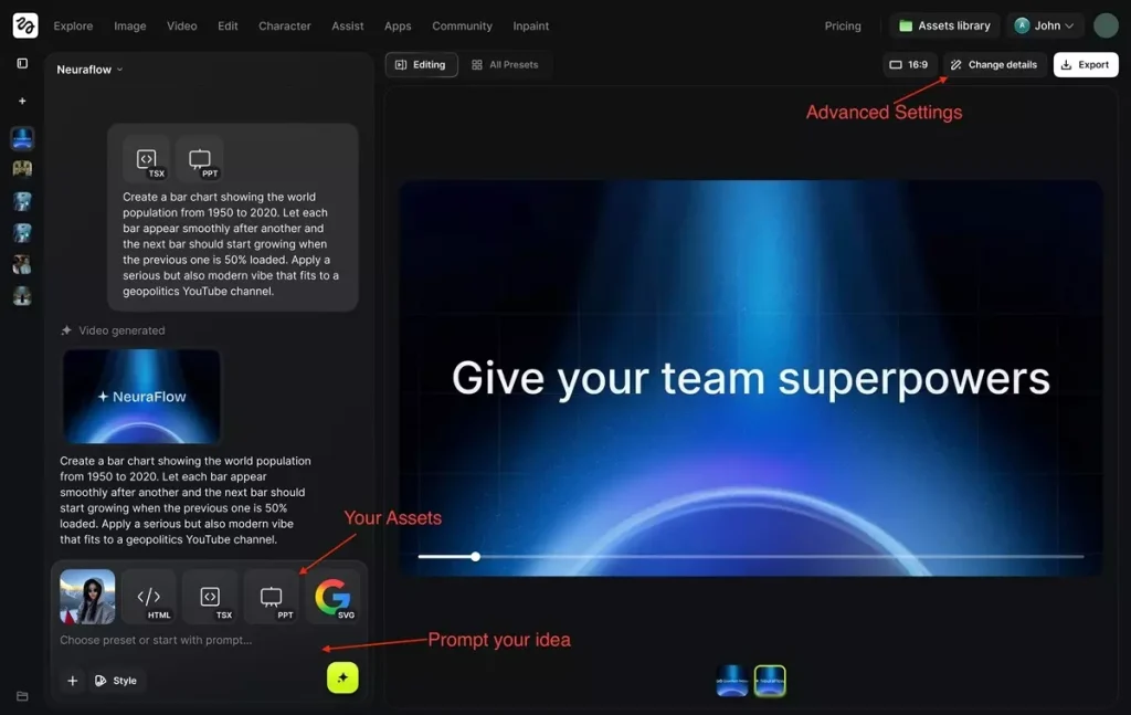 For example, you can type: “Create an animated line graph showing a sharp increase in users, with a glowing green line on a dark background.”
