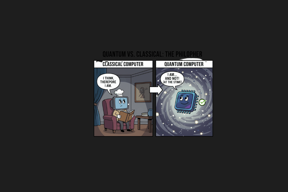 The “Quantum Maze Solver” cartoon visually explains how quantum computers can transcend traditional limitations. The classical computer is trapped in the center of a complex maze, having “tried every path!” This symbolizes the exhaustive, brute-force approach classical algorithms often take. The quantum computer, on the other hand, confidently declares, “I BENT REALITY!” as it effortlessly navigates by literally folding the maze. This clever imagery represents quantum tunneling and superposition, where a quantum system can find the optimal path or solution by effectively “bending” or exploring multiple paths through the problem space at once, rather than being confined to a single, linear route.